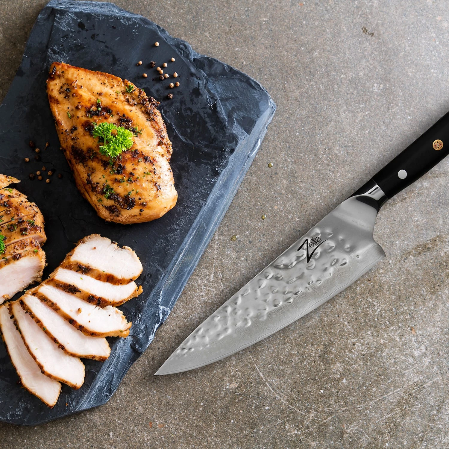 Das 8″ Chefkochmesser der Alpha-Royal Japanese Serie von Zelite Infinity by Klarstein ist eine Weiterentwicklung unseres ursprünglichen Kochmessers. Wir haben unser gehämmertes Tsuchime-Finish über das bereits atemberaubende Damaszener-Muster gelegt, was dem Messer noch mehr Stil und Klasse verleiht. Als eines der vielseitigsten Messer in deiner Küche ist dieses Kochmesser rasiermesserscharf und hat mit 57 mm eine breitere Klinge als dein Standard-Kochmesser. Es ist ideal zum Schneiden von Fleisch, Würfeln von Gemüse, Zerteilen von Obst, Zerkleinern von Kräutern, Hacken von Nüssen und vielem mehr – ein unverzichtbares Werkzeug in deiner Küche.
