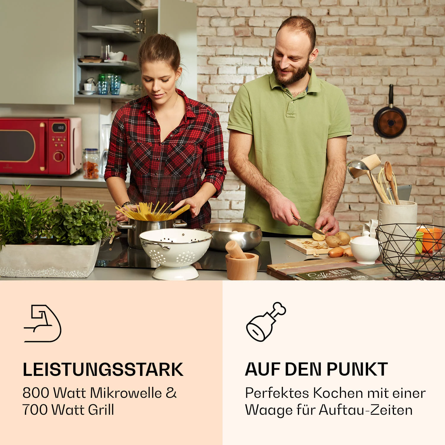 Hier dreht sich alles um köstliche Mahlzeiten und leckere Snacks! Die Julieta von Klarstein ist eine leistungsstarke Mikrowelle mit Grillfunktion mit einem Volumen von 20 Litern und einem 25,5 cm großen Drehteller. 3 Grill- und 5 Leistungsstufen lassen keine kulinarischen Wünsche offen, während du mit den 8 Auto-Programmen die gängigsten Gerichte besonders einfach und bequem zubereiten kannst. Super praktisch ist auch die Auftau-Funktion, bei der sich die nötige Arbeitszeit mit Hilfe einer Gewichtsskala einstellen lässt. In Kombination mit ihrem stilechten Retro-Look der 50er Jahre ist sie ein Highlight in jeder Küche.