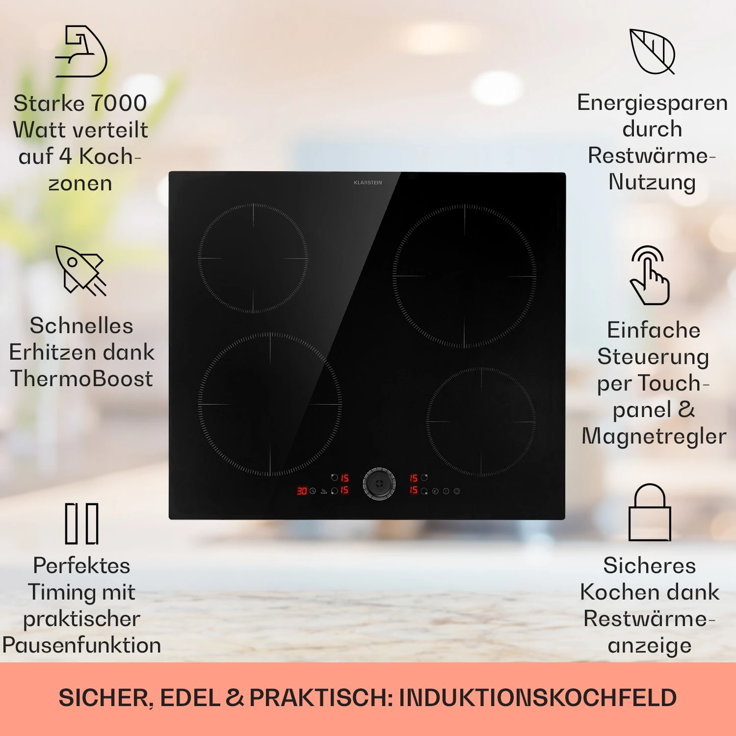 • Touch-Bedienfeld mit Digitalanzeige für Betriebsstufe, Timer und Restwärme