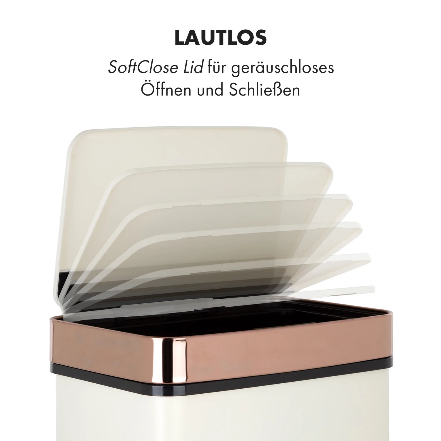 Mit seinem voluminösen Innenraum von 72 Litern bietet der Klarstein Royal Trash einen großen Müllbeutelbehälter von 43 Litern sowie 2 x 12,5 Liter große Recycling-Behälter. So können zum Beispiel sperriger Recycling-Abfall, Restmüll und Papier direkt beim Einwerfen getrennt werden. Besonders praktisch ist der eingehängte 4 Liter Eimer, in dem Bio-Abfälle entsorgt werden können und der dank Deckel mit einem zusätzlichen Geruchsschutz versehen sind. Das Befüllen des oberen Müllbehälters ist völlig berührungslos möglich: Dank Deckelsensor öffnet dieser sich vollautomatisch, sobald man in den Sensorbereich von etwa 20 cm Abstand kommt. 5 Sekunden, nachdem der Müll eingeworfen wurde schließt sich der Deckel wieder automatisch. Bei Bedarf kann der Deckel auch per Knopfdruck geöffnet und wieder geschlossen werden. Die 2 x 12,5 Liter großen Recycling-Behälter befinden sich in einer rollengelagerten Schublade und gleiten per Handgriff vor und zurück. Auch optisch weiß der Royal Trash Rose Gold zu überzeugen, sein glatter Edelstahl-Korpus ist nicht nur elegant, sondern auch unempfindlich gegenüber Fingerabdrücken. Kontrollleuchten am Bedienpanel informieren außerdem zuverlässig über Sensorstatus und Füllstand der eingelegten Batterien, während der SoftClose Lid-Mechanismus für ein besonders leises Öffnen und Schließen sorgt. Der Restmüll-Behälter des Klarstein Sensor-Mülleimers ist darüber hinaus mit einem aufgesteckten Klemmring ausgestattet, der einen festen Halt des Müllbeutels gewährleistet.