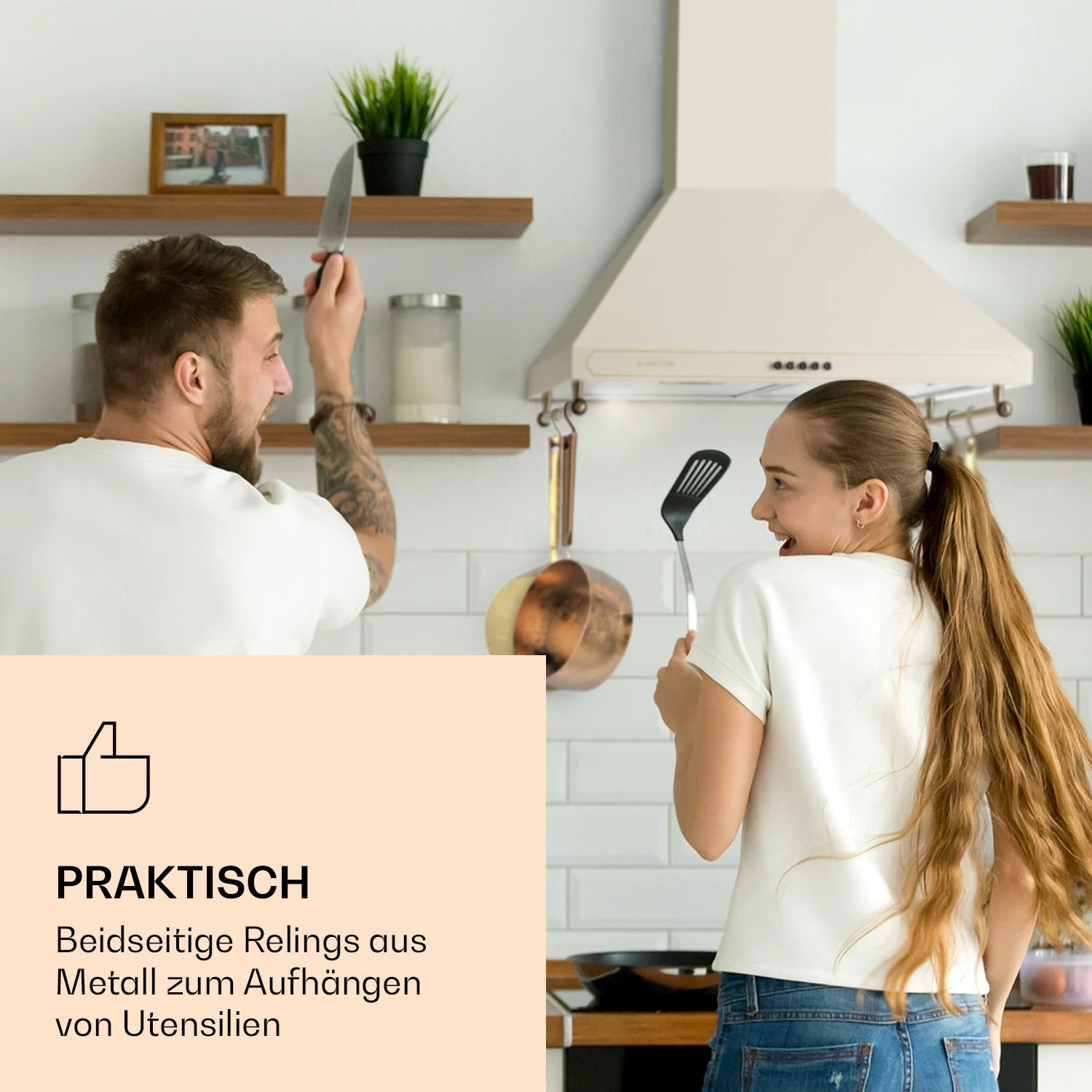 Die edle Klarstein Victoria 60 Retro-Dunstabzugshaube entfernt unverzüglich Essensgerüche und Dämpfe aus kleinen bis mittleren Küchen. Die Dunstabzugshaube mit dekorativen Retro-Elementen kann für unterschiedlich starke Kochaktivitäten mit 3 unterschiedlichen Leistungsstufen mit max. 644,5 m³/h Luftdurchsatz betrieben werden. Dank der zuschaltbaren Beleuchtung hast du das Kochfeld dabei gut im Blick. Praktisch und schön anzusehen sind auch die seitlichen Relinge zur Aufhängung von Küchenutensilien und die dekorativen Knöpfe.