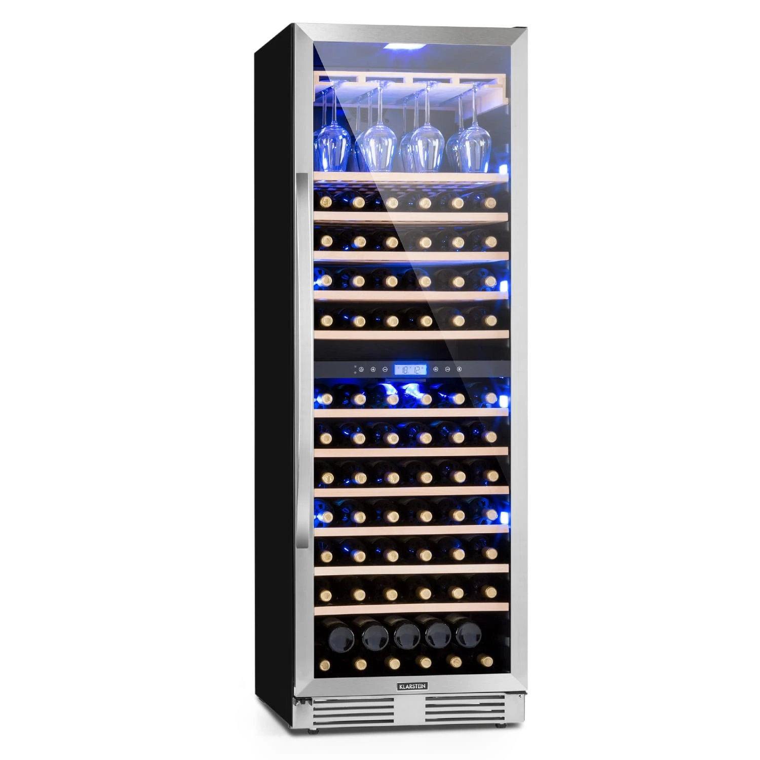 Der beleuchtete Klarstein Vinovilla Grande 165 Built-in Duo Zwei-Zonen-Weinkühlschrank bietet auf 12 Buchenholz-Einschüben Platz für 165 Flaschen Wein. Die edlen Tropfen ruhen bei passender Lagerungstemperatur – Weiß- und Rotweine gleichzeitig. Perfekt gekühlten Genuss erlebst du, da du parallel auf dem Glasträgerhalter bis zu 24 Weingläser auf die gleiche Kühltemperatur bringen kannst.